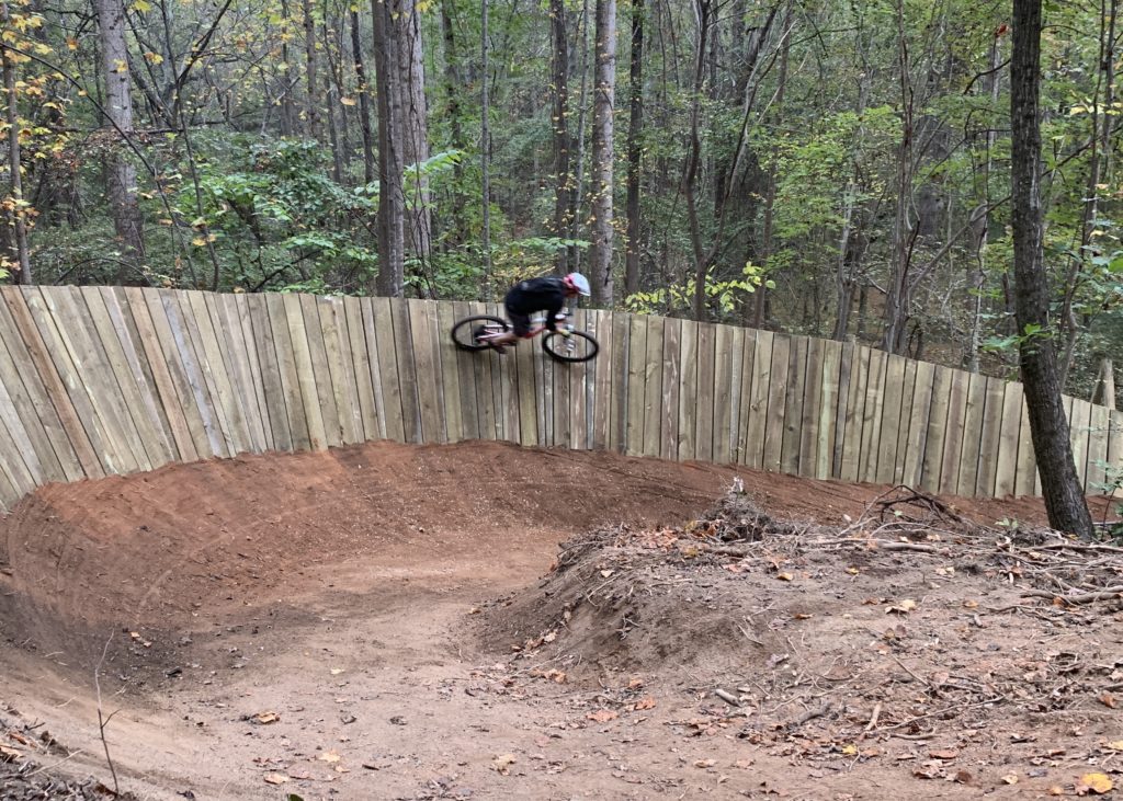 This trail system consists of three distinctly different one-mile loops, making Ballantyne eminently lappable. The “Flow Loop” is a smooth and fast, with little to no technical terrain, making it a perfect trail for beginning riders (or those who don’t like roots and rocks). The “Tech Loop” has a large rock garden, switchbacks, and a fast downhill bermed section. However, the main attraction of this loop is an optional detour to the first wall ride in the Charlotte metropolitan area. The “Field Loop” is an old-school hand cut trail full of roots and rocks. It also features a double-roller wooden bridge and several bermed turns.